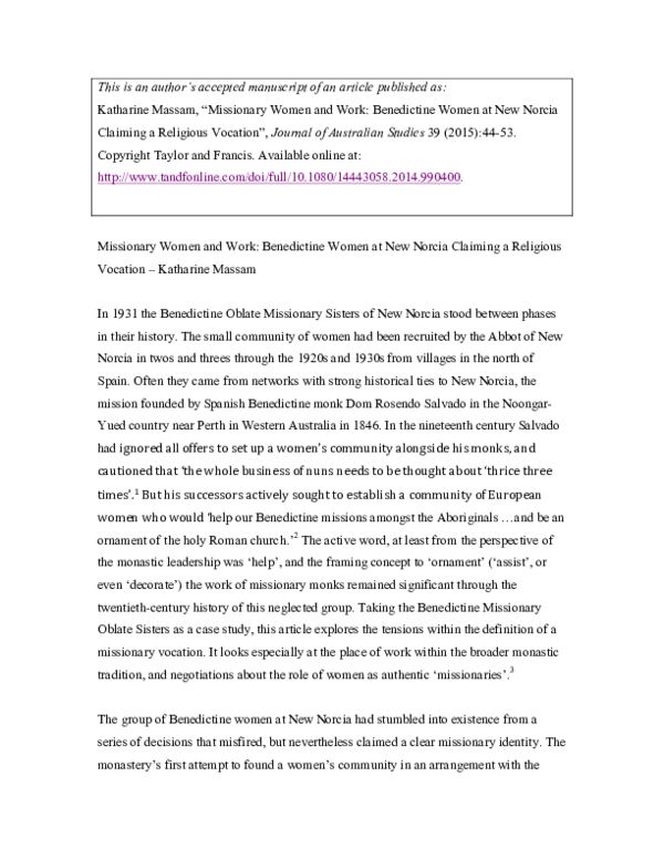 Pdf Missionary Women And Work Benedictine Women At New Norcia